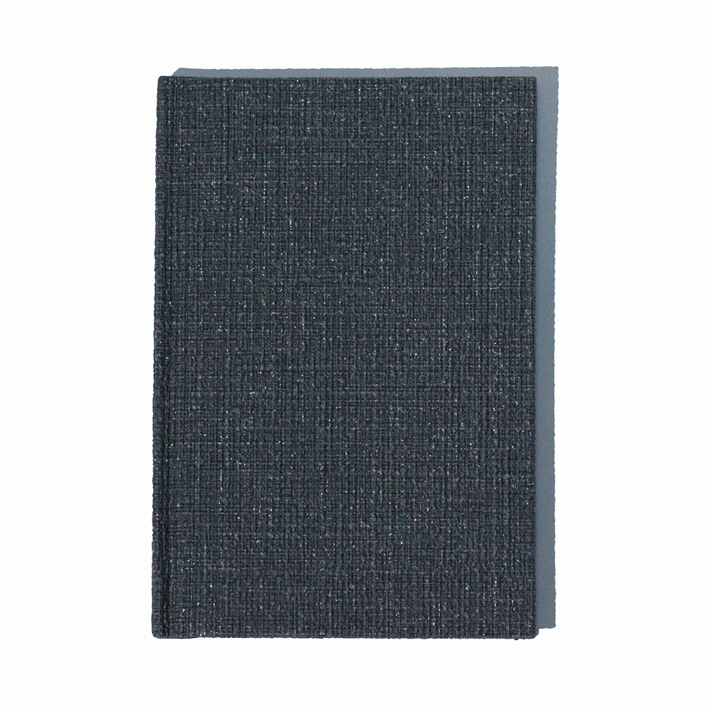 表紙とノートを接着する見返し用紙は小口と同じ黒色に、そして裏表紙をめくったところの裏見返しにはメタリック黒箔で箔押しをしました。